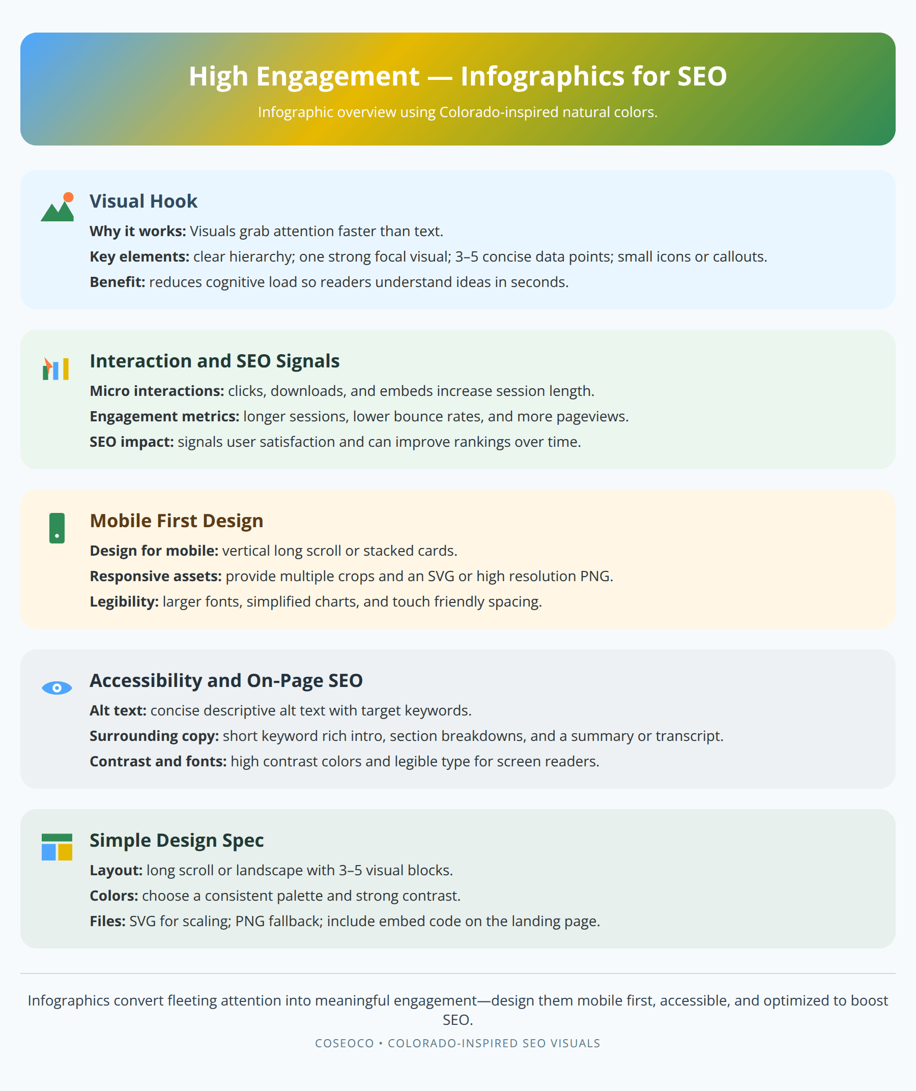 Finally, infographics support content variety and accessibility. Pairing an infographic with a short, keyword-rich article gives search engines both visual and textual signals to index. Providing descriptive alt text and a transcript or summary beneath the image ensures screen readers and crawlers can interpret the content. Accessibility considerations are vital, including using high contrast colors and legible fonts to ensure readability of infographics. Use a consistent color scheme, legible fonts, and contrast to emphasize important content and enhance visual appeal. In short, infographics convert fleeting attention into meaningful engagement, an essential step toward better search performance.